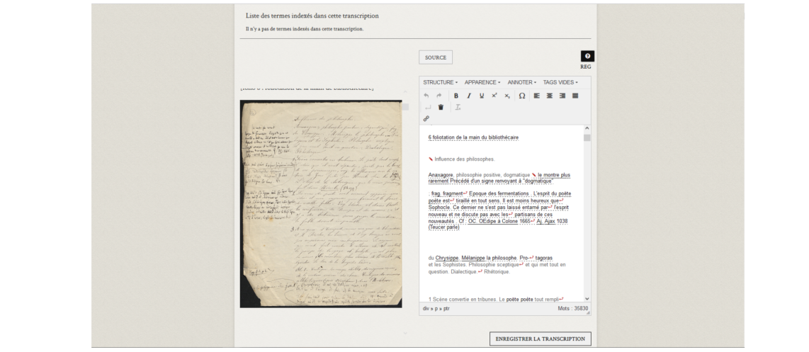 Pour ce faire, elle a activement participé au développement du plugin Transcript, un outil qui permet, au sein d'une seule et même interface la saisie et l'encodage au standard xml-TEI de documents pour le logiciel libre Omeka.